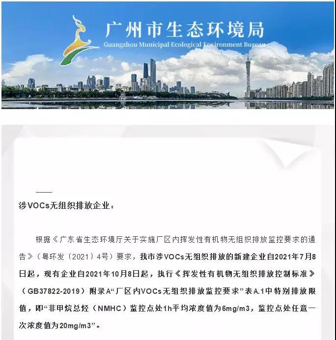 近日了解到:廣州生態環境發布一則《致我市涉VOCs無組織排放企業的一封信》,要求涉VOCs無組織排放的新建企業自2021年7月8日起,現有企業自2021年10月8日起,執行《揮發性有機物無組織排放控制標準》(GB37822-2019)附錄A“廠區內VOCs無組織排放監控要求”表A.1中特別排放限值,即“非甲烷總烴(NMHC)監控點處1h平均濃度值為6mg/m3,監控點處任意一次濃度值為20mg/m3”。
