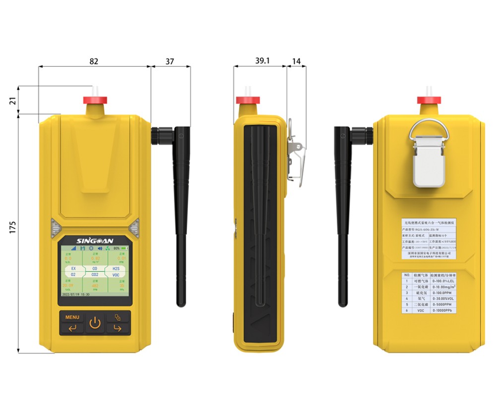 SGA-606系列便攜式六合一DMF氣體檢測儀小巧輕便,功能強大。2.4英寸高清液晶彩屏,實時顯示檢測目標氣體濃度值;內(nèi)置高性能采樣泵,1-10檔流速可調(diào);5000mA超大容量鋰電池,可連續(xù)工作20小時以上;內(nèi)置全生命周期監(jiān)控系統(tǒng),傳感器壽命到期、儀表故障、校準提醒,零點自動修正等一應(yīng)俱全,還可一鍵復位恢復出廠設(shè)置;中文簡體、英文、中文繁體三種語言系統(tǒng),適合所有人群操作。umol/mol、ppm、ppb、%LEL、%VOL、mg/m3、ug/m3、g/m3、mg/l、g/l等濃度單位之間自由切換,氣體濃度值一目了然;支持本地存儲10萬條以上數(shù)據(jù),自動存儲歷史記錄、報警記錄、故障記錄、開關(guān)機時間等數(shù)據(jù),數(shù)據(jù)存儲間隔時間1-999秒可調(diào);支持PC-TWA時間加權(quán)平均容許濃度和PC-STEL短時間接觸容許濃度:數(shù)據(jù)可通過儀器自帶的專用軟件通過USB進行導出Excel表格,進行編輯、打印、存儲等工作;標配水阱過濾器,有效過濾粉塵顆粒物和水汽,提高檢測精度,延長傳感器使用壽命;也可選配內(nèi)置無線模塊,通過4G流量卡實時將監(jiān)測數(shù)據(jù)上傳到物聯(lián)網(wǎng)平臺;智能光感控制功能,儀表會自動根據(jù)當前光照度調(diào)節(jié)屏幕亮度;大氣壓指標監(jiān)測,特別適合高海拔環(huán)境下使用;標配鱷魚夾,可在使用過程中真正解放雙手,不影響正常作業(yè);防跌倒報警功能,當人員發(fā)生意外跌倒,檢測儀則會持續(xù)進行報警,提醒其他工作人員及時救援;特別適合進入隧道、管廊、地窖、污水池、下水道、礦井、密閉空間等場所的作業(yè)人員使用;