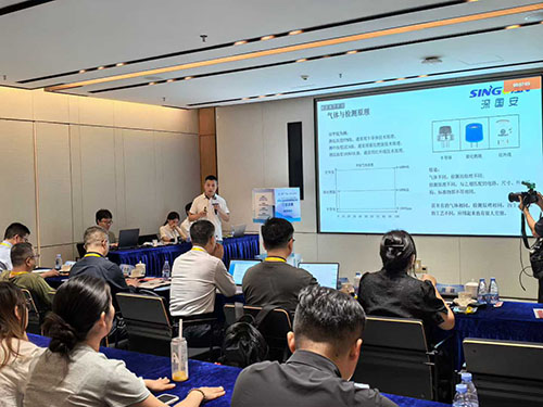 決賽現場,深國安總經理張繼國介紹了其自主研發的智能氣體傳感器前沿技術成果,傳感器采用全新設計理念,將集成模塊化,實現不同氣體傳感器的靈活組合與替換,極大地提高了傳感器的通用性和可維護性,同時大幅降低使用成本。智能氣體傳感器家族涵蓋電化學、催化燃燒、熱傳導式、光離子化(PID)、非分光紅外(NDIR)等多原理技術應用,針對不同氣體檢測場景構建了完整技術矩陣。該模塊技術將傳感器芯片、信號處理單元、智能算法模塊集成于尺寸僅21.5mm×31mm 的封裝內,通過內置的32位雙核處理器實現每秒200次的動態數據校準,在- 40℃至70℃的極端環境下仍能保持±3%FS的檢測精度,較傳統產品體積縮小60%,功耗降50%。