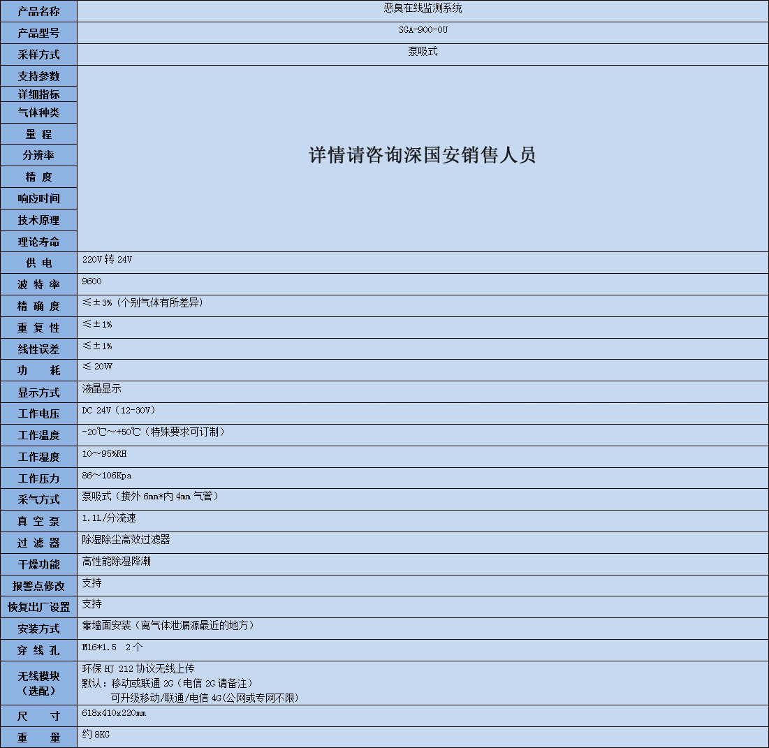 SGA-900-OU惡臭在線監(jiān)測(cè)系統(tǒng)由供電單位、采樣單元、樣氣過(guò)濾單元、傳感器檢測(cè)單元、數(shù)據(jù)處理單元、顯示單元和傳輸單位組成。可同時(shí)監(jiān)測(cè)包括惡臭在內(nèi)的六種氣體、外加PM2.5、PM10、溫度、濕度共十個(gè)參數(shù)指標(biāo);工業(yè)級(jí)高精觸摸屏,完美顯示當(dāng)前濃度值、最大值、最小值、1分種和1小時(shí)平均值,并可選取任意時(shí)間段時(shí)間歷史數(shù)據(jù)查詢,曲線顯示;內(nèi)置大容量存儲(chǔ)芯片,可輕松存儲(chǔ)10萬(wàn)以上數(shù)據(jù),并通過(guò)專用接口數(shù)據(jù)導(dǎo)出;深國(guó)安專利技術(shù)的預(yù)標(biāo)定智能型氣體傳感器,即插即用,方便維保、更換;機(jī)箱采用戶外專用納米防護(hù)涂層技術(shù),耐日曬雨淋、隔熱、防蚊蟲,可在戶外長(zhǎng)期使用;兼容TCP、IP、MODBUS 等通信協(xié)議,即可無(wú)線數(shù)據(jù)上傳對(duì)接當(dāng)?shù)丨h(huán)保局,也可有線遠(yuǎn)傳組網(wǎng);