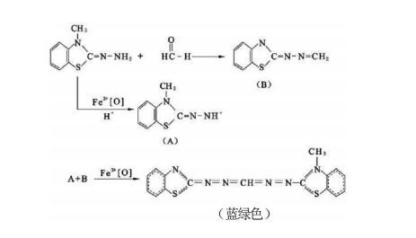 酚試劑3-甲基-2-苯并噻唑啉酮腙鹽酸鹽水合物(MBTH)檢測原理為3-甲基-2-苯并噻唑啉酮腙鹽酸鹽水合物(酚試劑)對于醛類具有極高的靈敏度,空氣中的甲醛與3-甲基-2-苯并噻唑啉酮腙鹽酸鹽水合物反應生成嗪,嗪在酸性溶液中被高鐵離子氧化形成藍綠色化合物,同時根據顏色深淺,能夠比色定量甲醛的濃度。